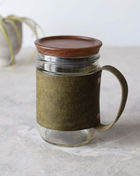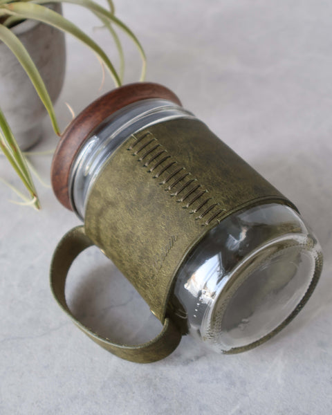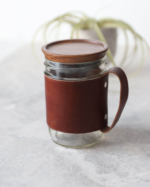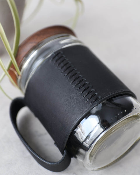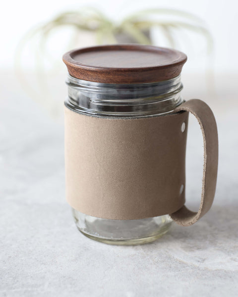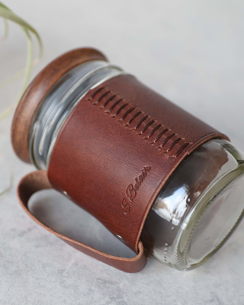 Meet our new leather sleeve for mason jars, featuring a sturdy built-in handle and a smooth wooden lid. Handcrafted from quality leather, it protects your jar and makes it more comfortable to carry. Practical, durable, and naturally stylish, it’s perfect for hot or cold drinks at home or on the go.